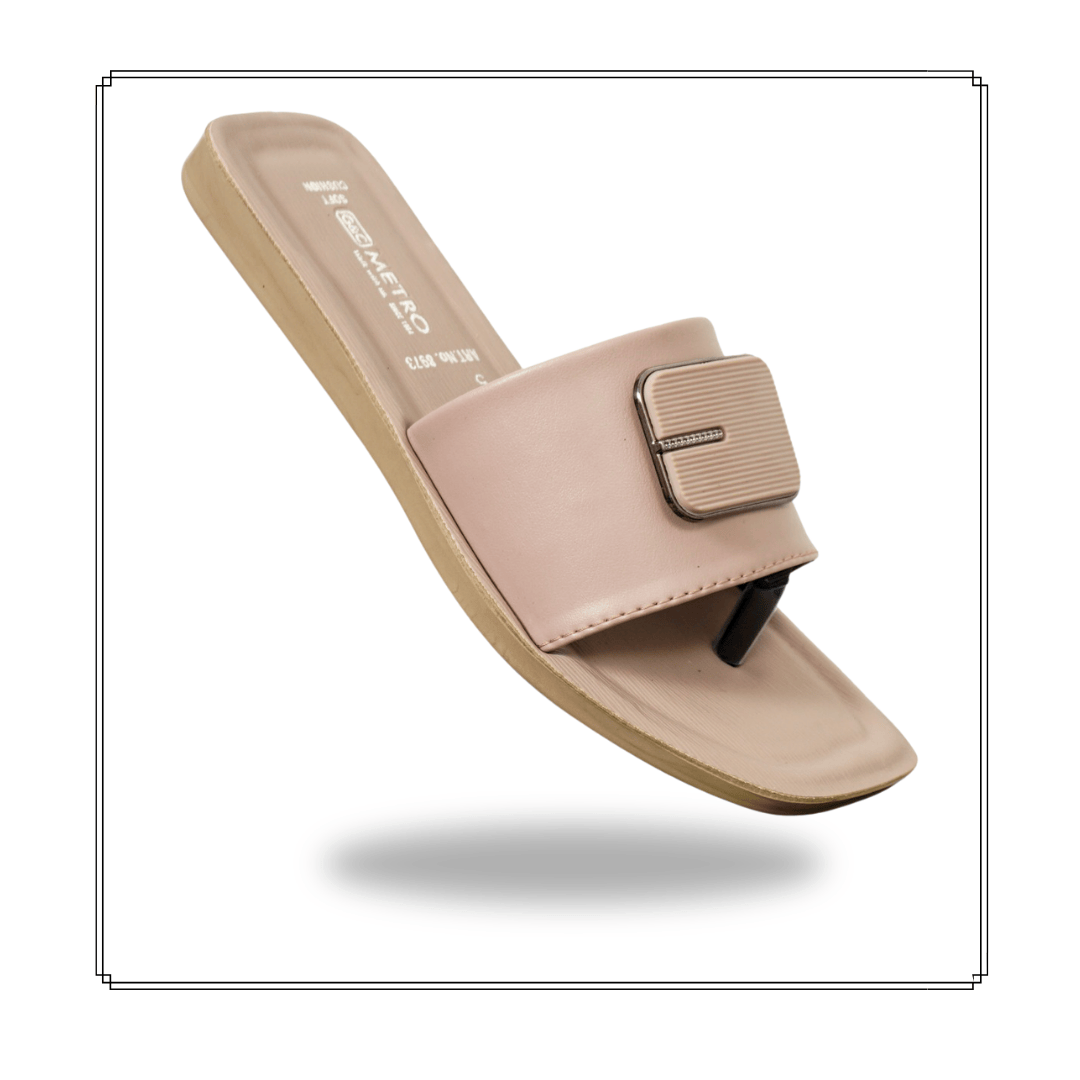 PU Sole Ulra soft air cell cushion technology chic women’s slide sandal. Crafted with a smooth nude-toned synthetic leather strap, rectangular metallic ornament with ribbed detailing and a subtle embellishment for a touch of sophistication.