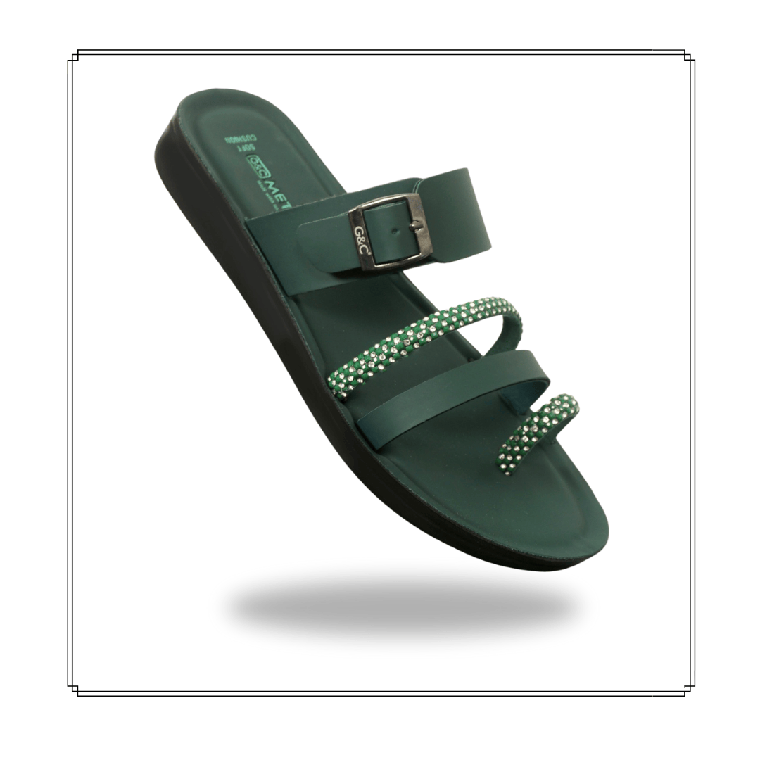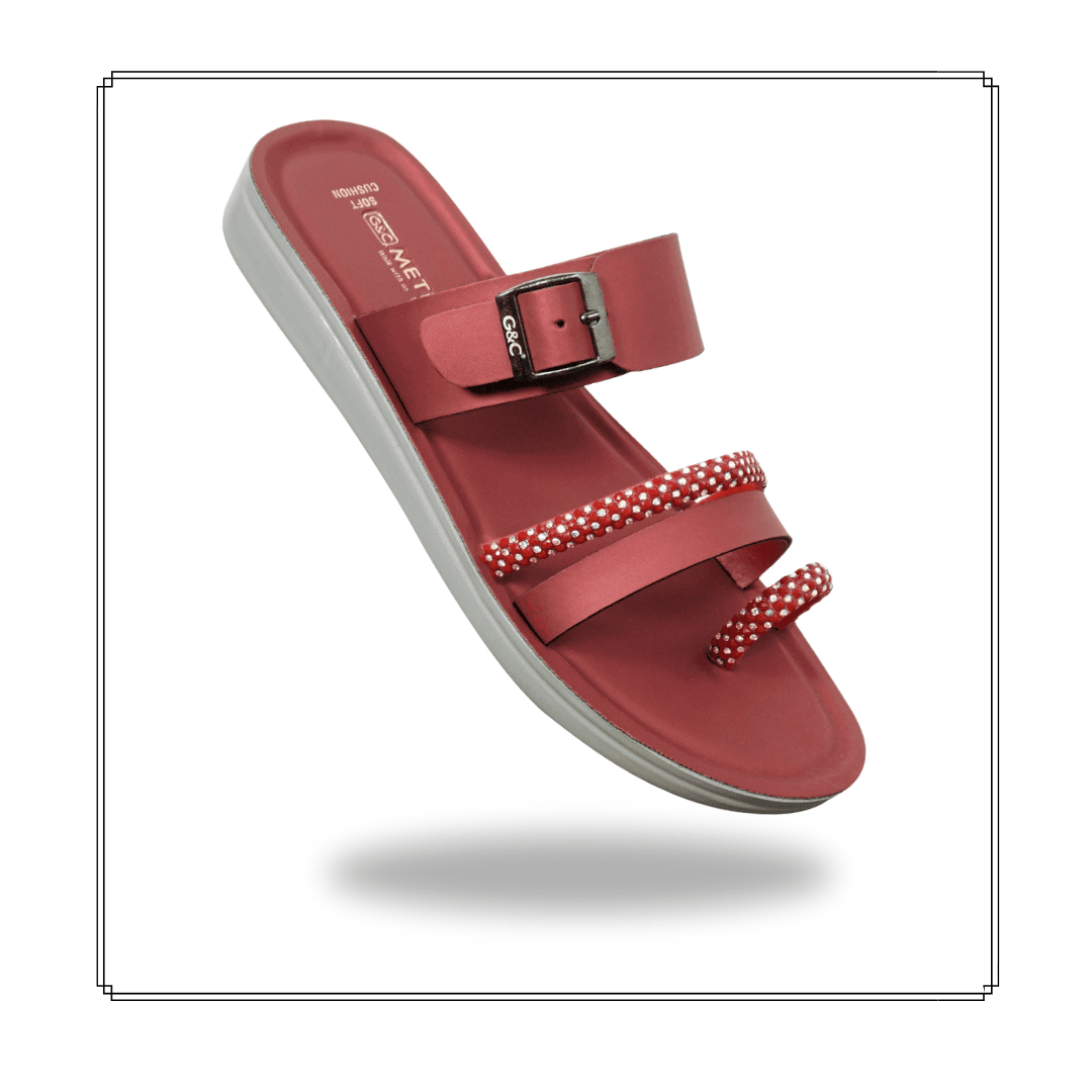 Multi color ultra soft Air-cell cushion technology dailywear women’s collection. upper strap designed One plain red strap and two red-and-white polka dot straps (midfoot and toe loop), adding playful contrast and visual rhythm. Wide strap with a metallic “C&C” buckle, offering adjustable fit and a bold brand accent.