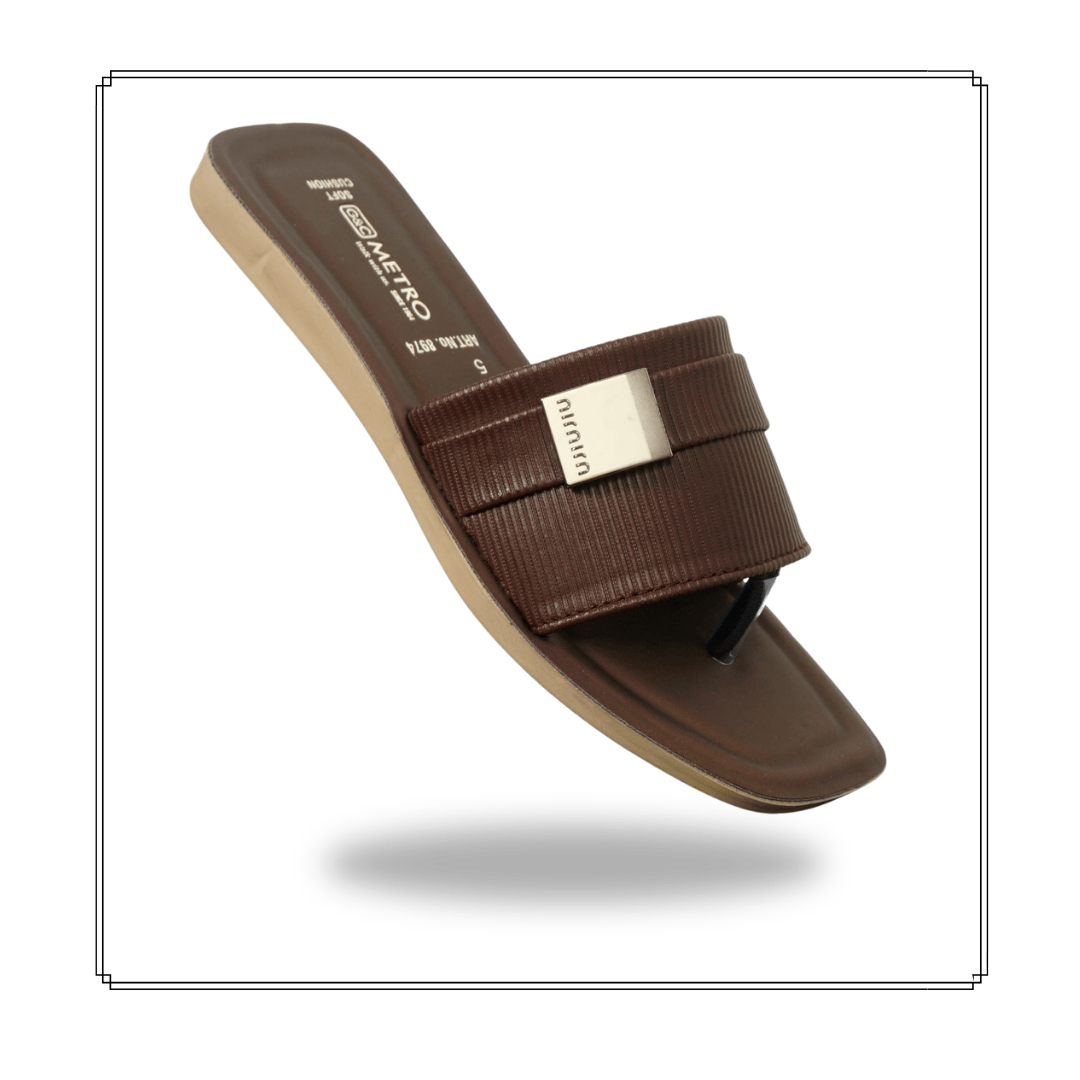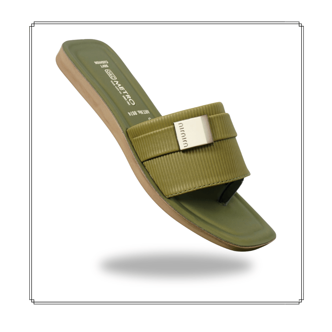 PU Sole Ulra soft air cell cushion technology chic women’s slide sandal. Crafted with a smooth nude-toned synthetic leather strap, rectangular metallic ornament with ribbed detailing for every day wear.